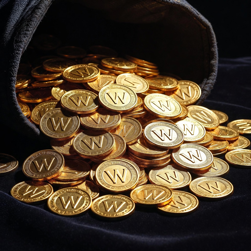 A bag tipped over shows many gold coins on a dark surface. The coins have a distinct symbol. Light reflects on their shiny surface.