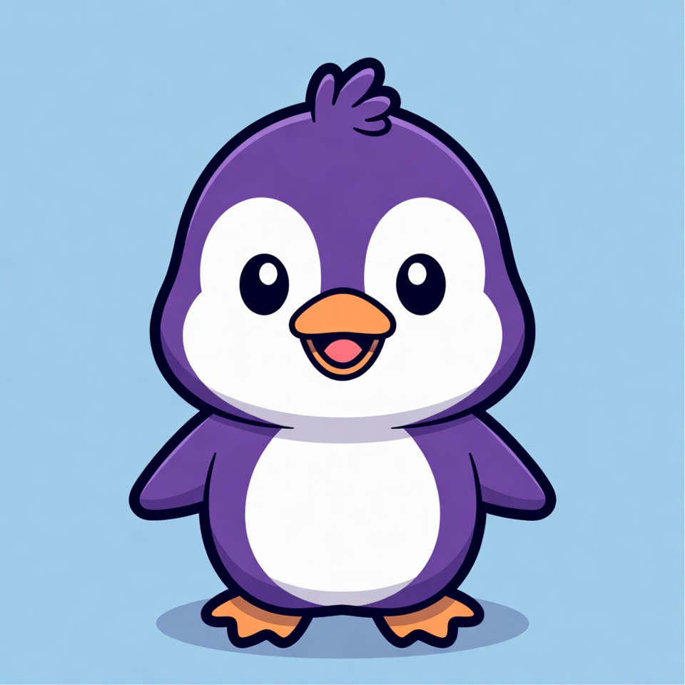 A cartoon penguin stands and smiles. It has a rounded body, purple color, and a cheerful expression. This is a playful and friendly design.