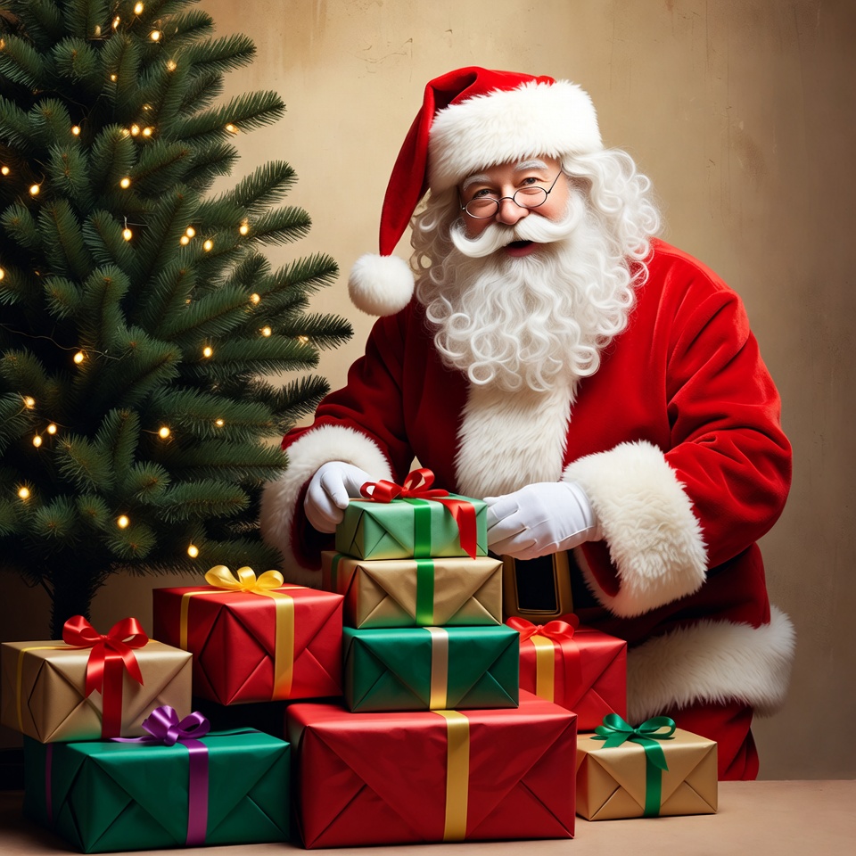 Santa stands next to a Christmas tree, arranging wrapped gifts with colorful bows. The scene shows holiday cheer and anticipation.