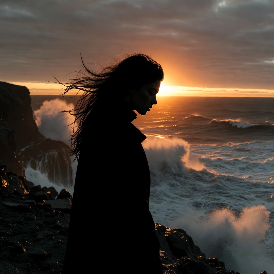 beauty, clouds, coast, evening, horizon, landscape, light, nature, ocean, person, reflection, rocky, sea, shore, silhouette, stormy, sunset, water, waves, wind