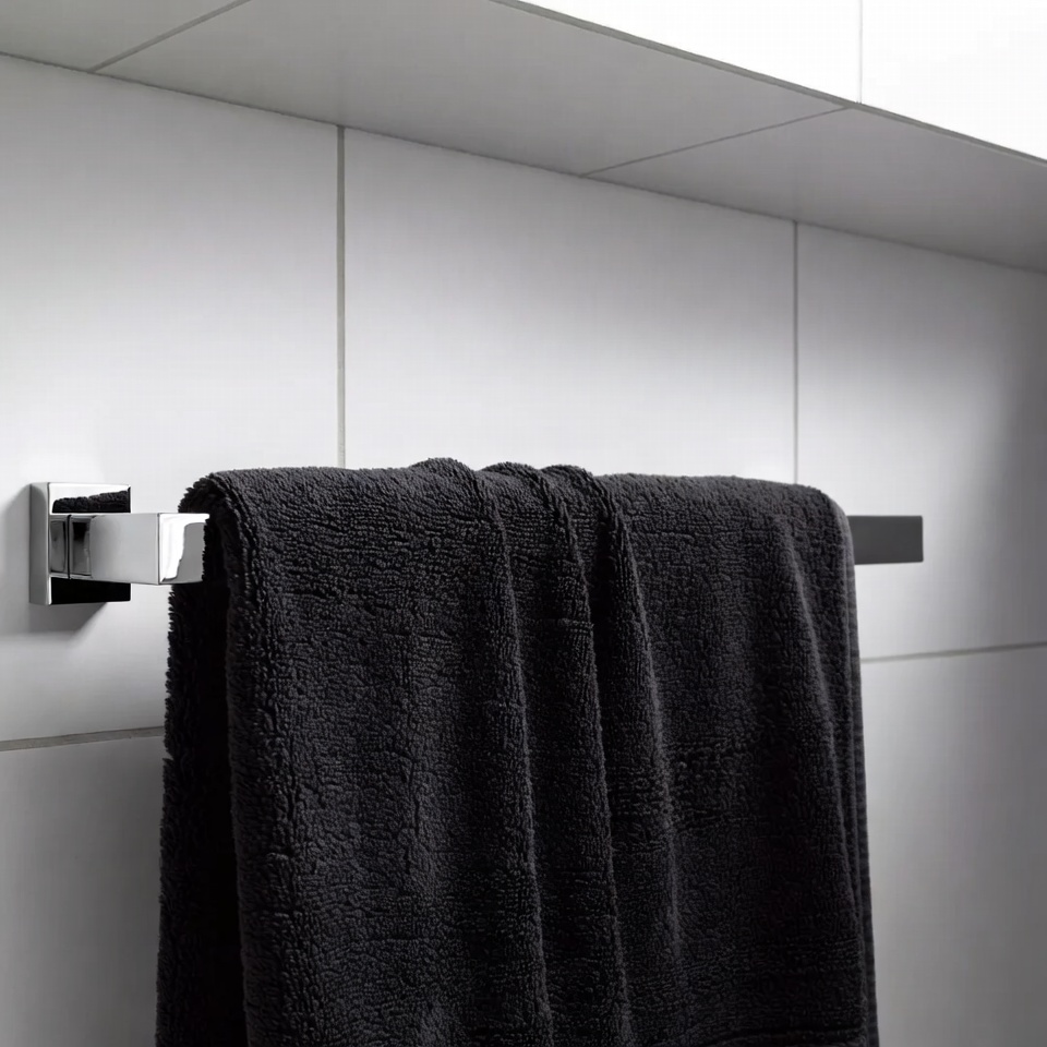 A black towel is hanging on a metal rack in a bathroom. The setting has white tiles and minimal decor.