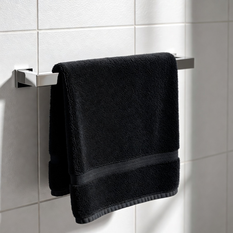 bathing, bathroom, bathroom accessories, black towel, clean, decor, design, hanging, home, hygiene, interior, light, rack, shadow, silver rack, soft, textile, towel, utility, white tiles