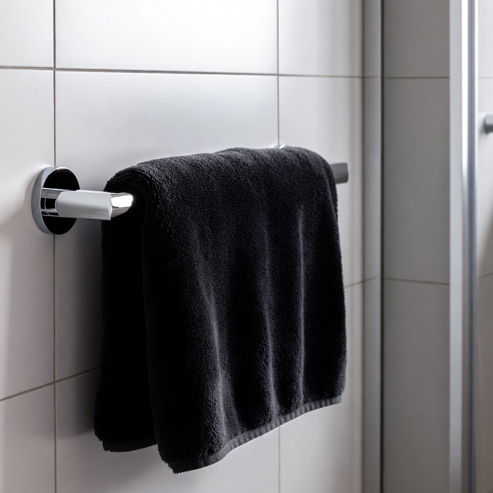 A black towel is hung on a towel rack in a modern bathroom with gray tiles. The setting shows a clean and organized space.