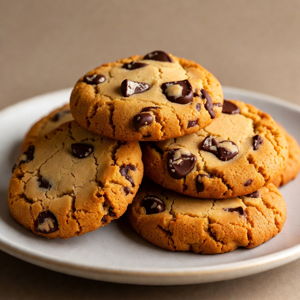 Five chocolate chip cookies are stacked neatly on a white plate. The cookies have visible chocolate pieces and are ready to eat.