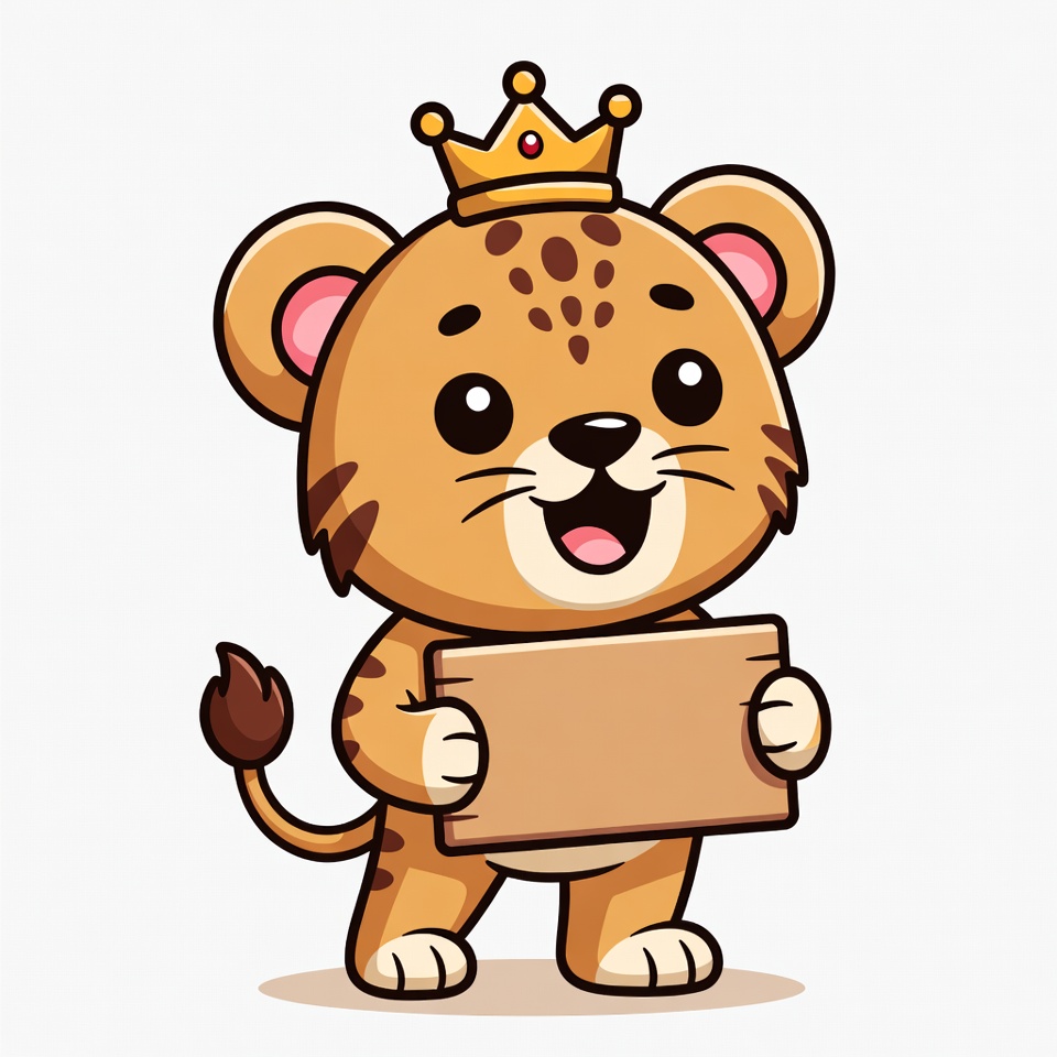 A cartoon lion with a crown happily holds a blank sign. It stands against a plain background, ready for messages or announcements.