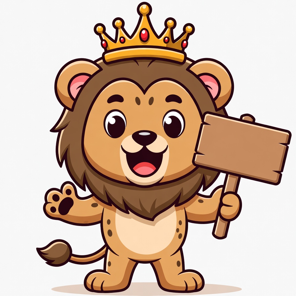 A cartoon lion stands with a large smile, wearing a crown and holding a wooden sign in its paw. The background is plain and simple.