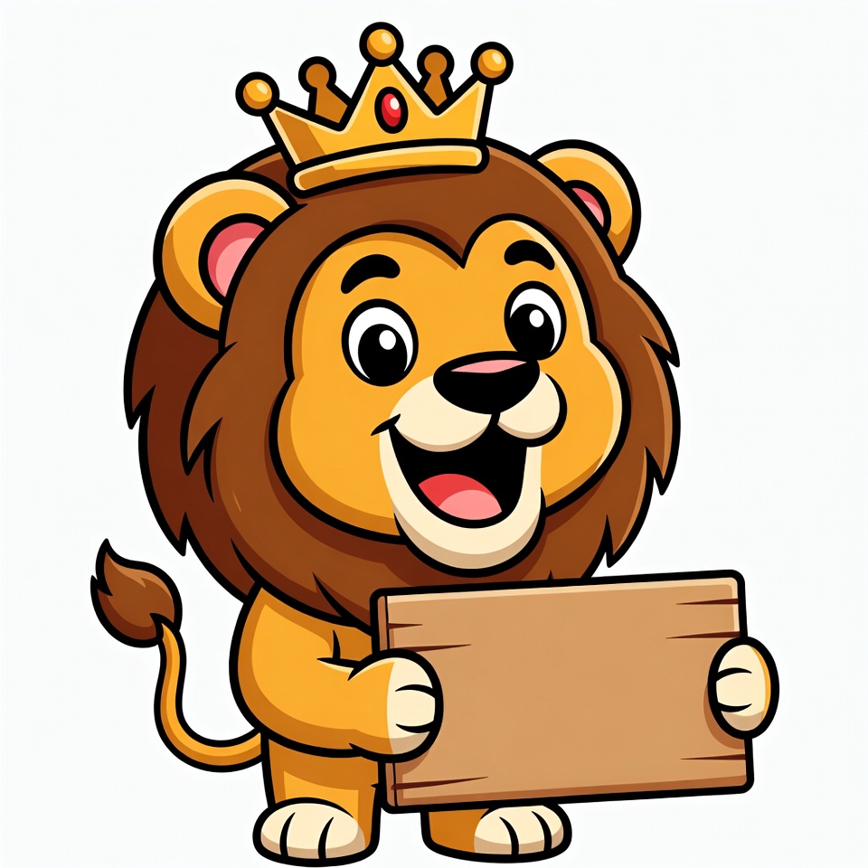 A lion with a crown smiles while holding a blank sign. The scene shows a friendly cartoon style, inviting interaction or messages.