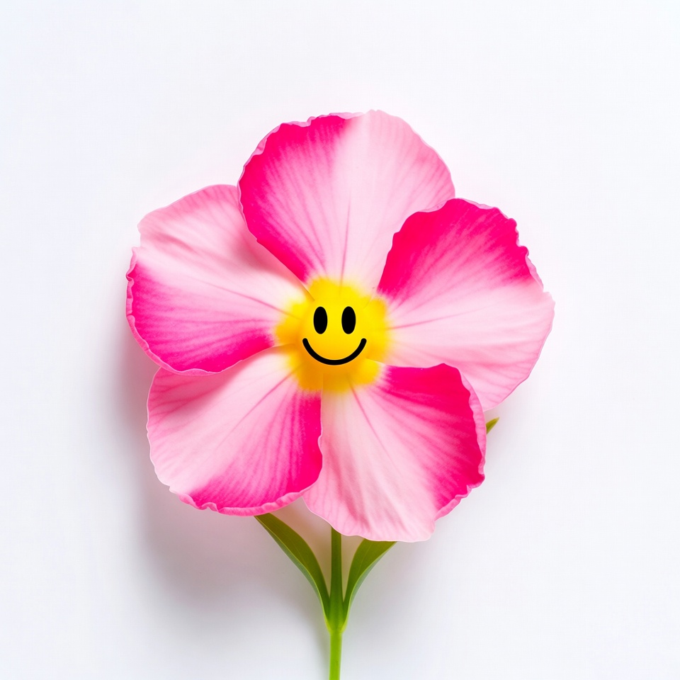 A pink flower with a smiling face is placed on a white background. The flower has bright colors and a cheerful appearance.
