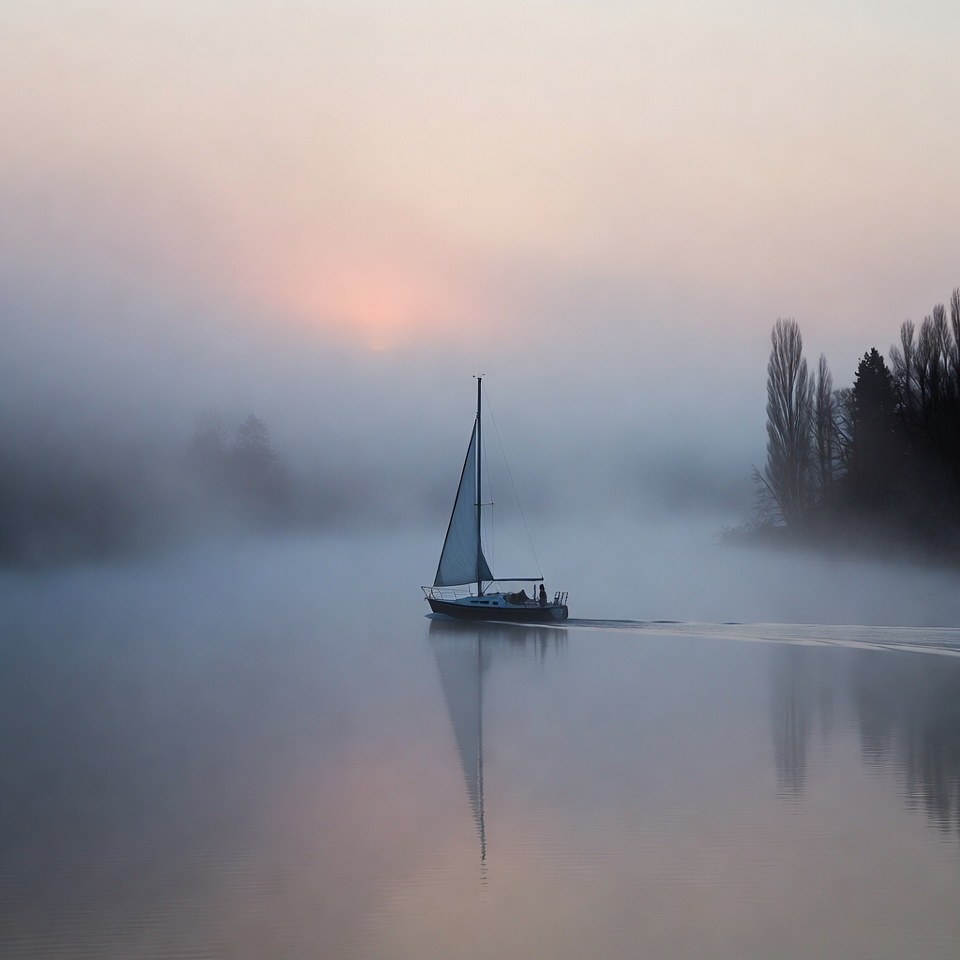 atmosphere, boat, calm, fog, lake, morning, move, nature, outdoors, quiet, reflection, river, sail, scene, sky, stillness, sunrise, travel, trees, water