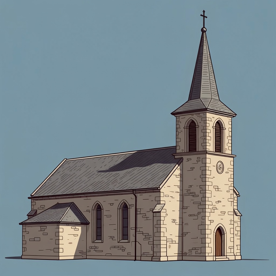 A small stone church stands alone against a blue background. It features a tall spire and simple architectural design.