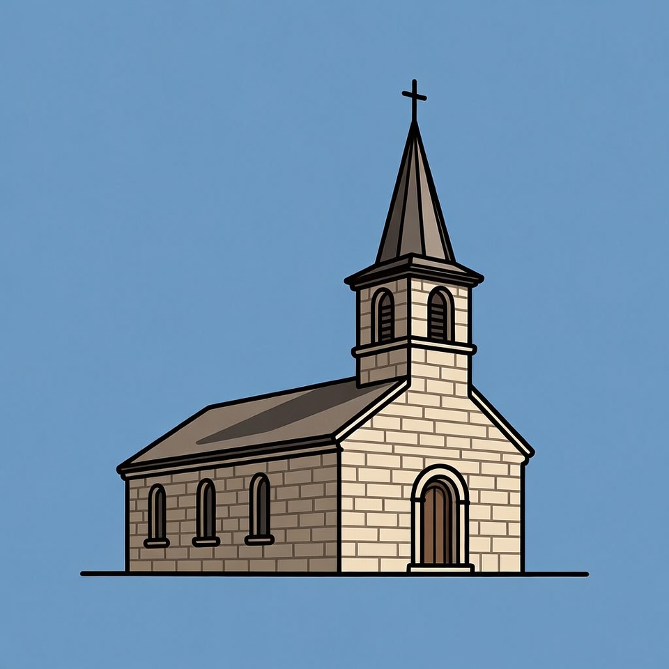 A drawing of a stone church with a steeple and cross on top. The church features several windows and a wooden door.