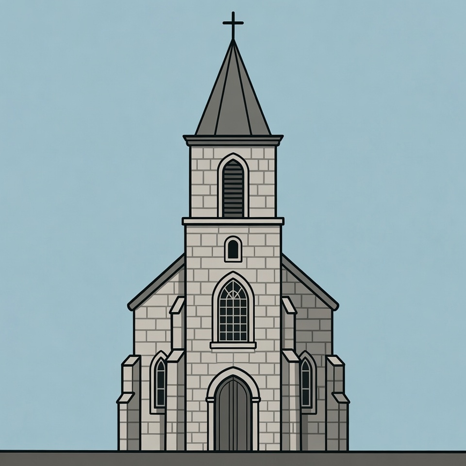 A stone church stands tall with a spire and cross. The exterior is simple, showcasing a door and arched windows.