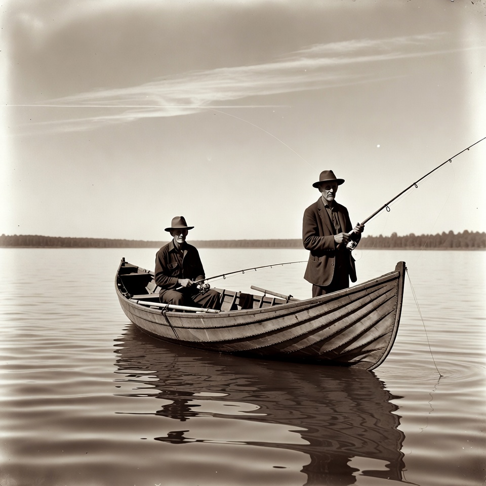 activity, boat, calm, casting, fishing, hats, lake, leisure, line, men, nature, outdoor, reflection, scenery, summer, sunlight, trees, two, vintage, water