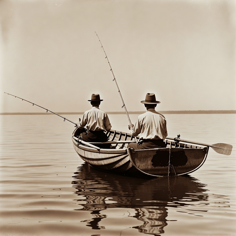Two men sit in a small boat on a lake. They hold fishing rods and wait quietly to catch fish. The water is still and clear.