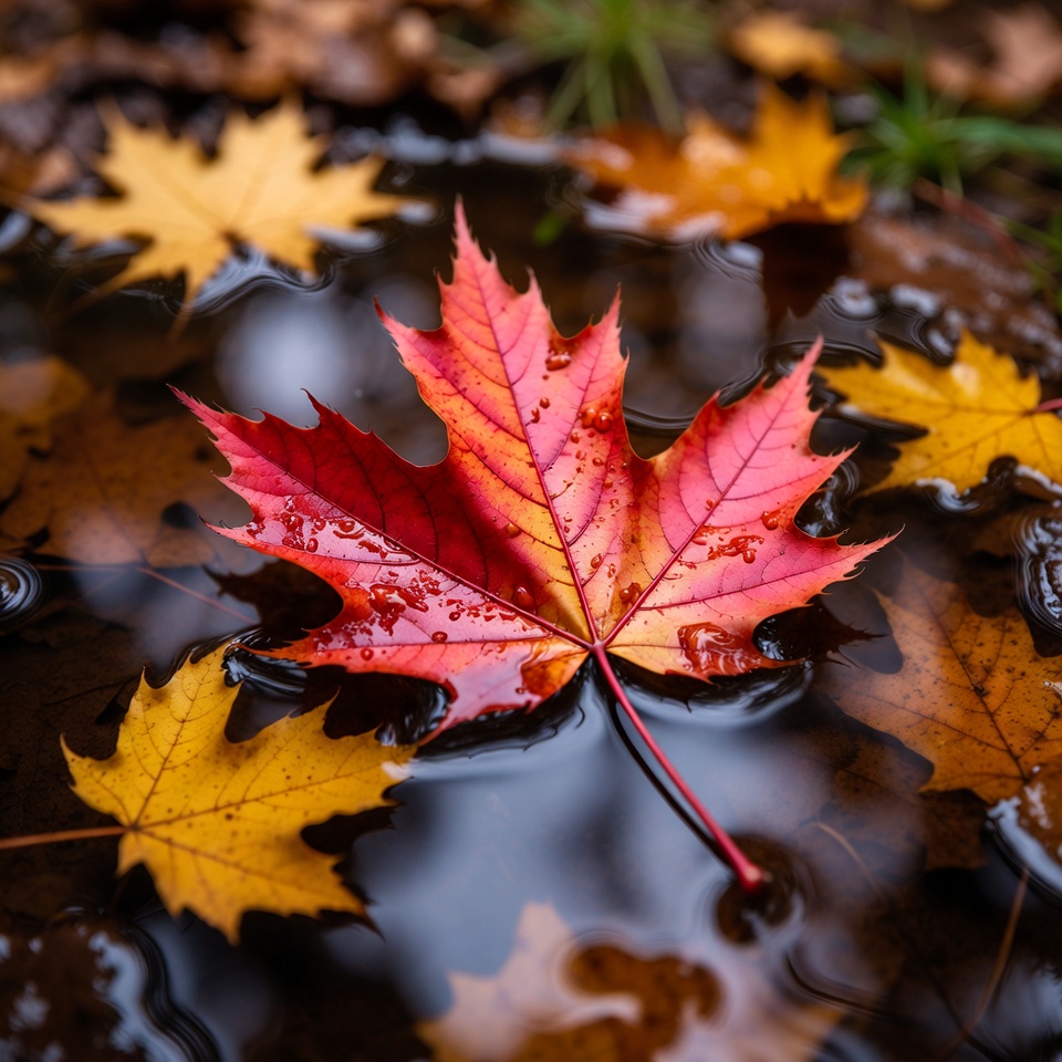 autumn, colors, drops, environment, foliage, forest, ground, landscape, maple leaf, nature, outdoors, peaceful, plants, red leaf, reflection, scenery, seasonal, tranquil, water, yellow leaves