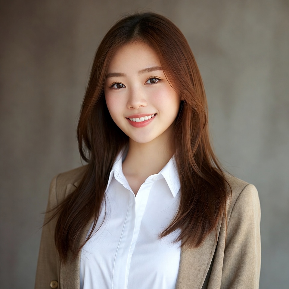 A young woman smiles while wearing a suit jacket and white shirt. She stands against a gray background.