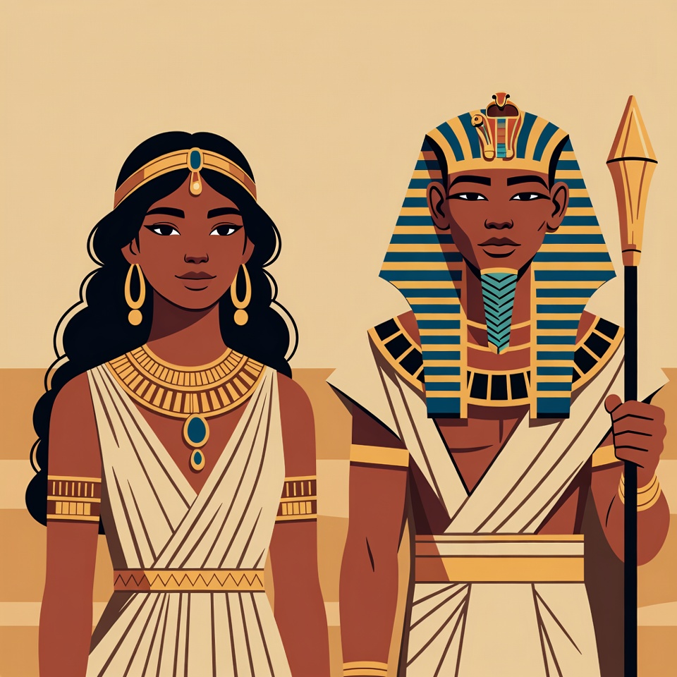 Two figures stand in ancient Egypt. One is a woman wearing a dress and jewelry. The other is a man holding a spear in traditional attire.