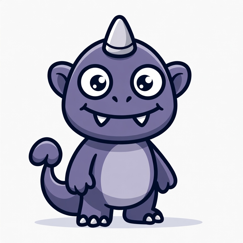 A cartoon monster stands with a big smile. It has large eyes, a small horn, and a playful demeanor. The creature looks cheerful and friendly.