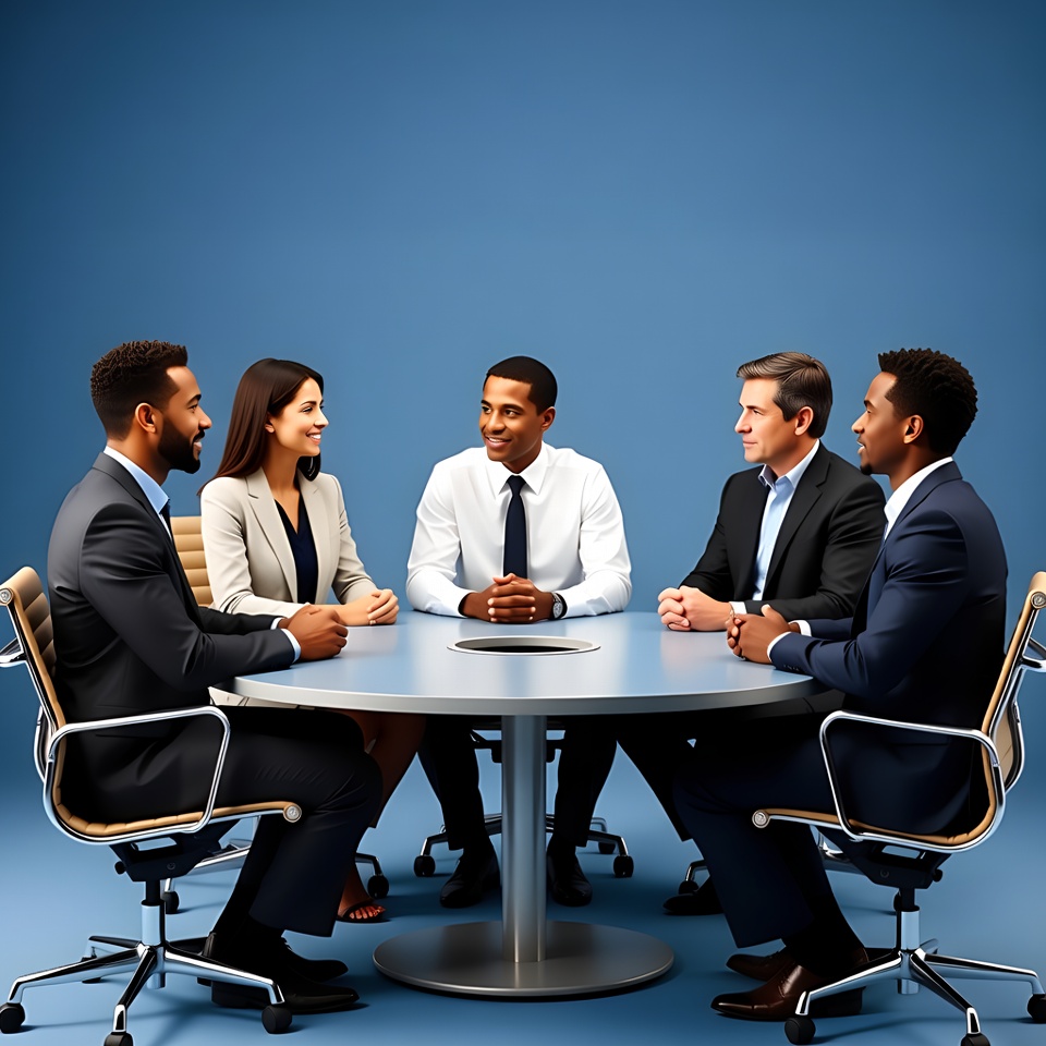 Five people sit around a table discussing ideas. The setting is an office with a blue background. Each person is focused on the conversation.