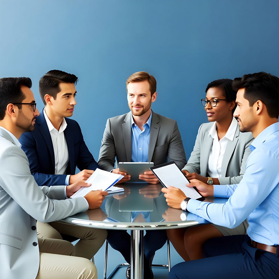 Business professionals sit at a round table discussing ideas and reviewing documents in a modern office setting during daytime.