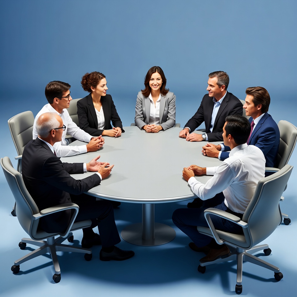 Eight people gather around a round table for a business meeting. They discuss ideas and strategies in a bright studio setting.