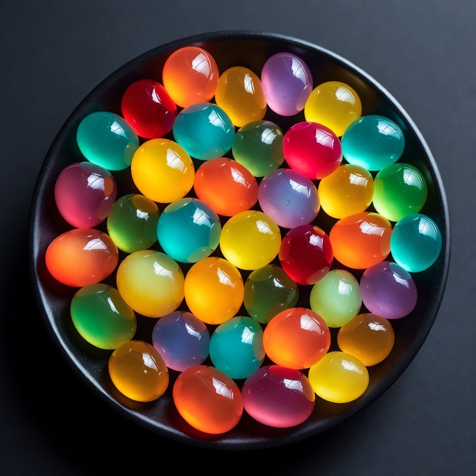 A bowl holds many jelly orbs in various colors. The orbs have a shiny surface and are arranged closely together. They create a vibrant display.