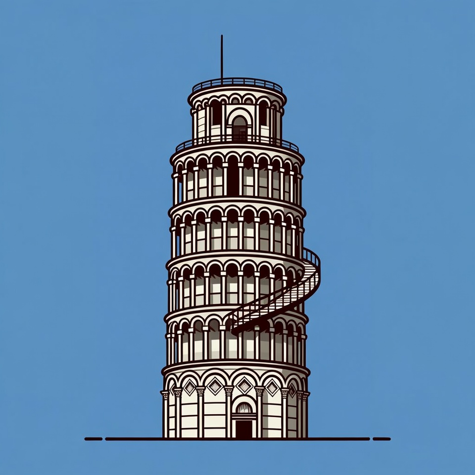 A tall, leaning tower stands against a blue sky. The structure features arches and a spiral staircase leading to the top.