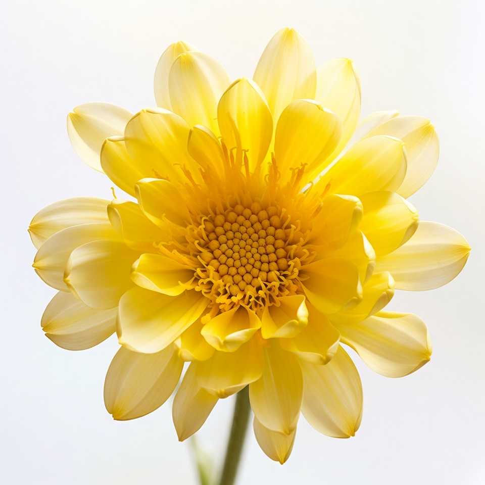 A yellow flower displays its petals with a center full of tiny structures. It stands upright against a light background.