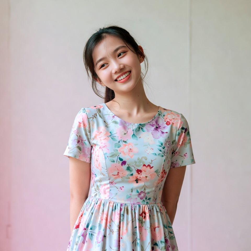 A girl stands with a smile wearing a floral dress. She is in a light-colored room with pastel walls. Her hair is pulled back.