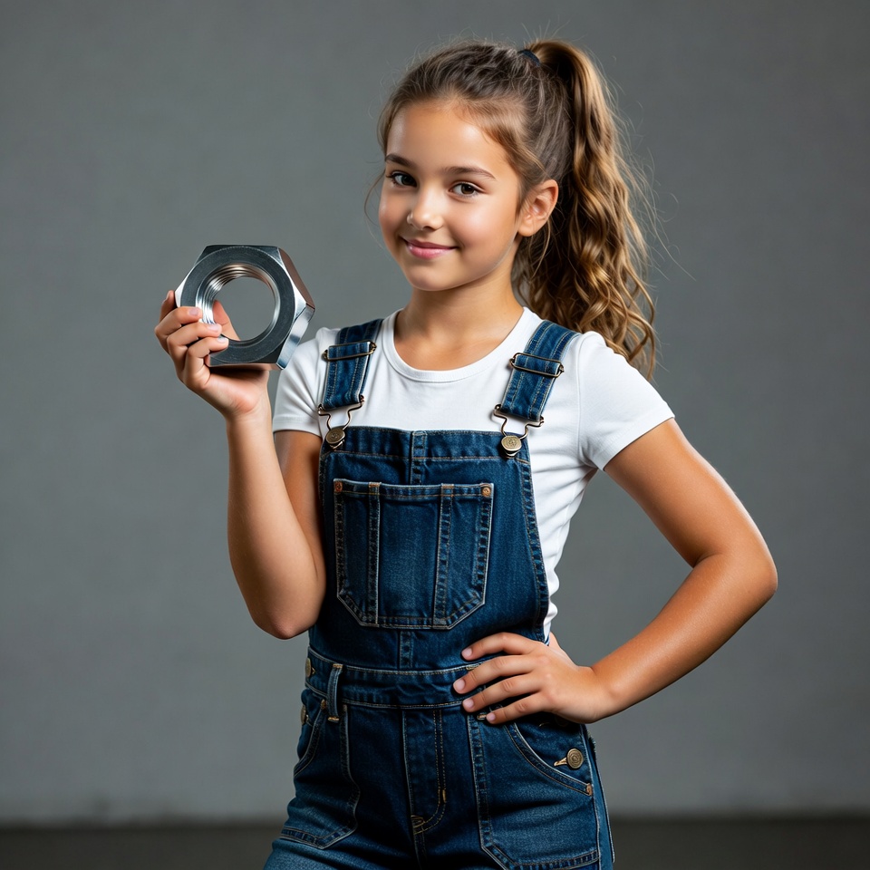 A young girl stands confidently, holding a large metal nut in her hand. She wears overalls and smiles at the camera in a simple indoor setting.