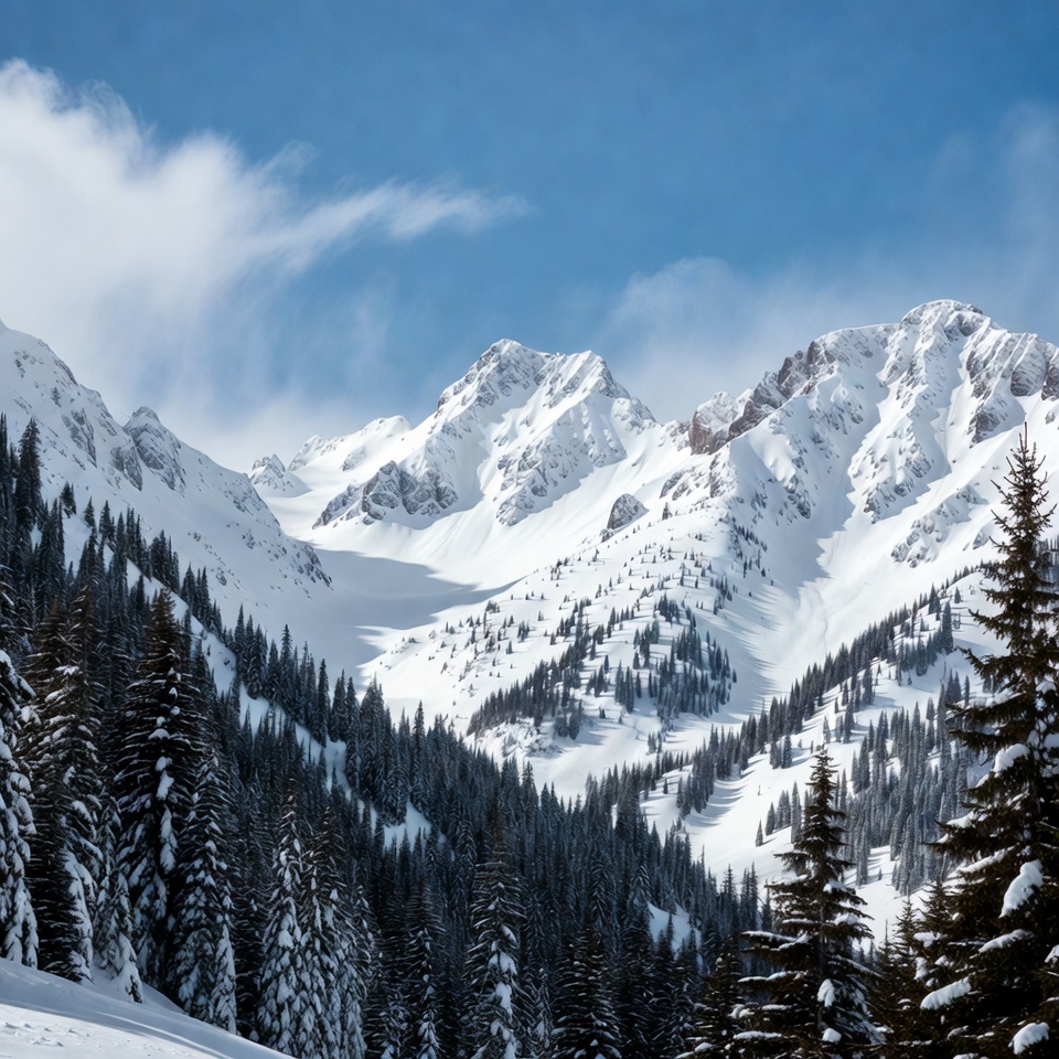alpine scenery, blue sky, clouds, cold weather, forest view, hiking, mountain range, natural beauty, nature scene, outdoor activity, pine trees, scenic view, snow-covered, snowflakes, snowy mountains, tranquility, travel destination, wilderness, winter day, winter landscape