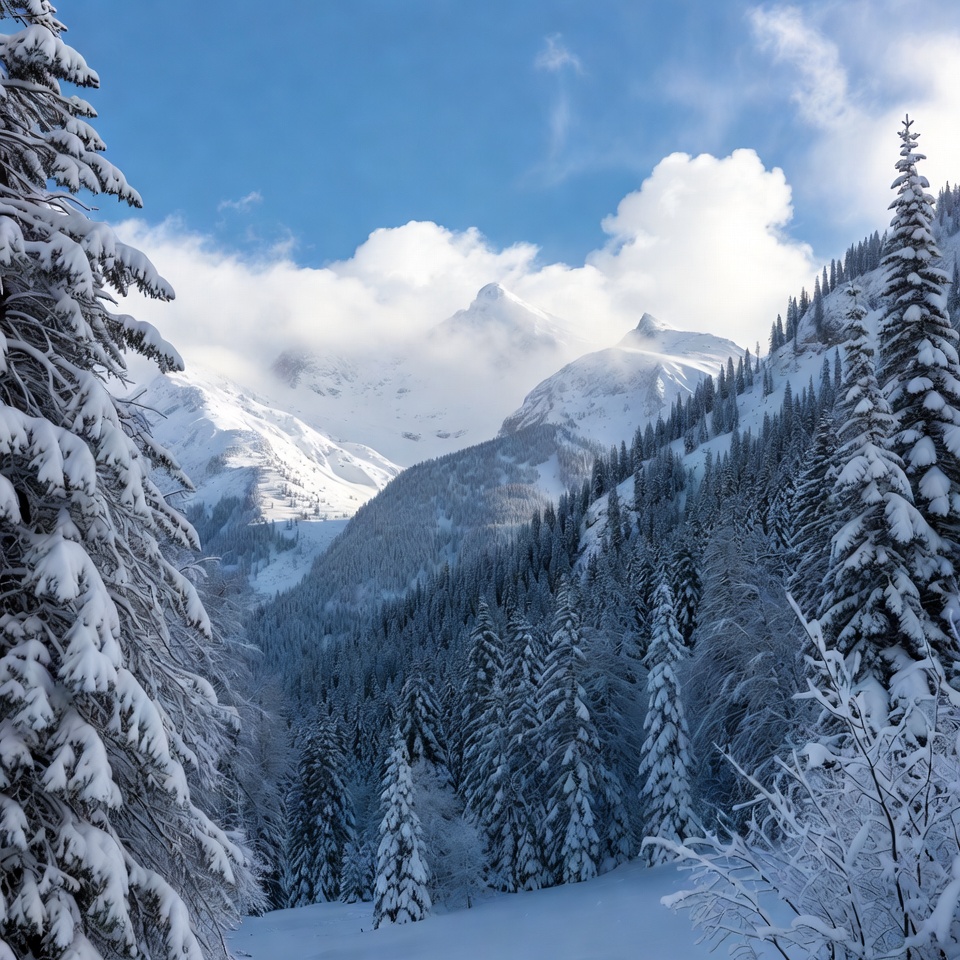 Tall trees are covered in snow while mountains stand in the background under a blue sky with fluffy clouds during winter.