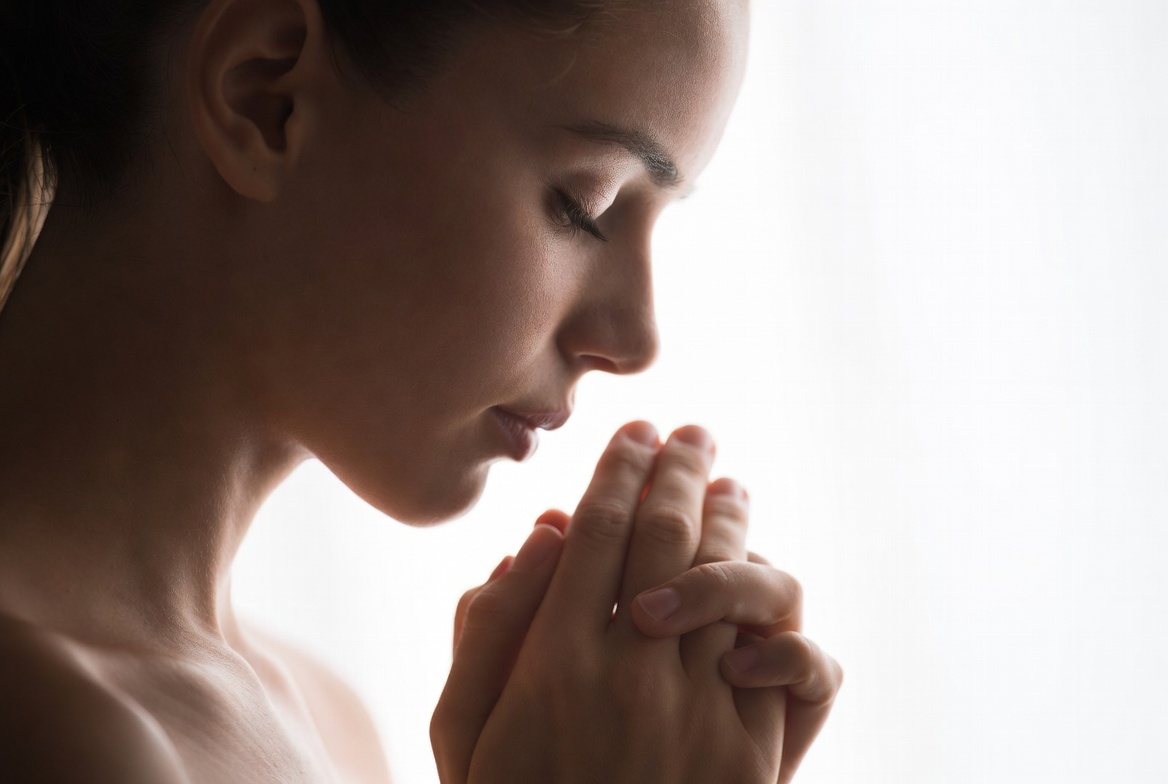 A woman holds her hands together in prayer while standing by a window. Soft light highlights her profile and serene moment of reflection.