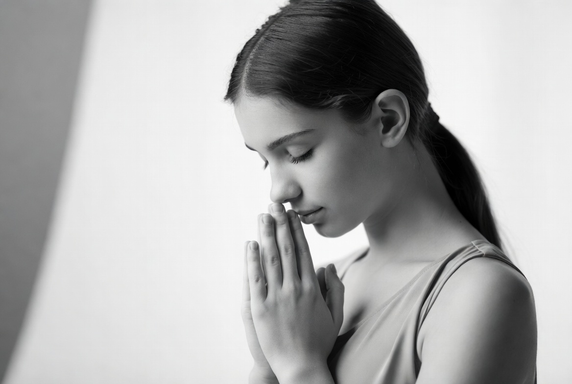A girl with long hair bows her head and puts her hands together in prayer. The background is soft and simple, focusing on her gesture.