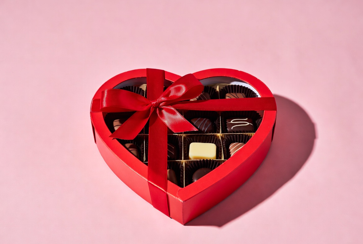 A heart-shaped box filled with assorted chocolates sits on a pink surface. The box is adorned with a red ribbon.