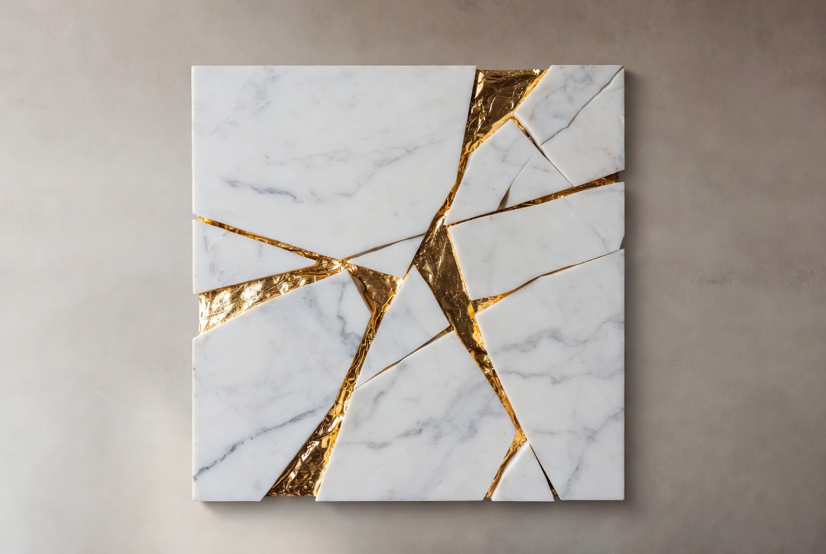 A square piece shows a marble design split with gold lines. The material is smooth and polished. It is placed against a plain wall.