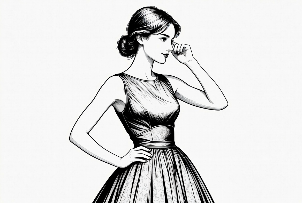 A woman stands with her hand on her face, lost in thought. She wears a dress and appears deep in contemplation.