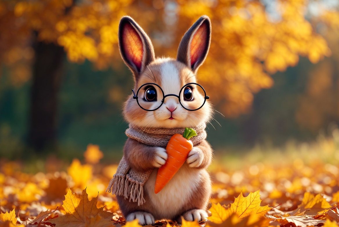 A rabbit wearing glasses stands in a pile of orange and yellow leaves. It holds a carrot and appears to gaze forward in the autumn scene.