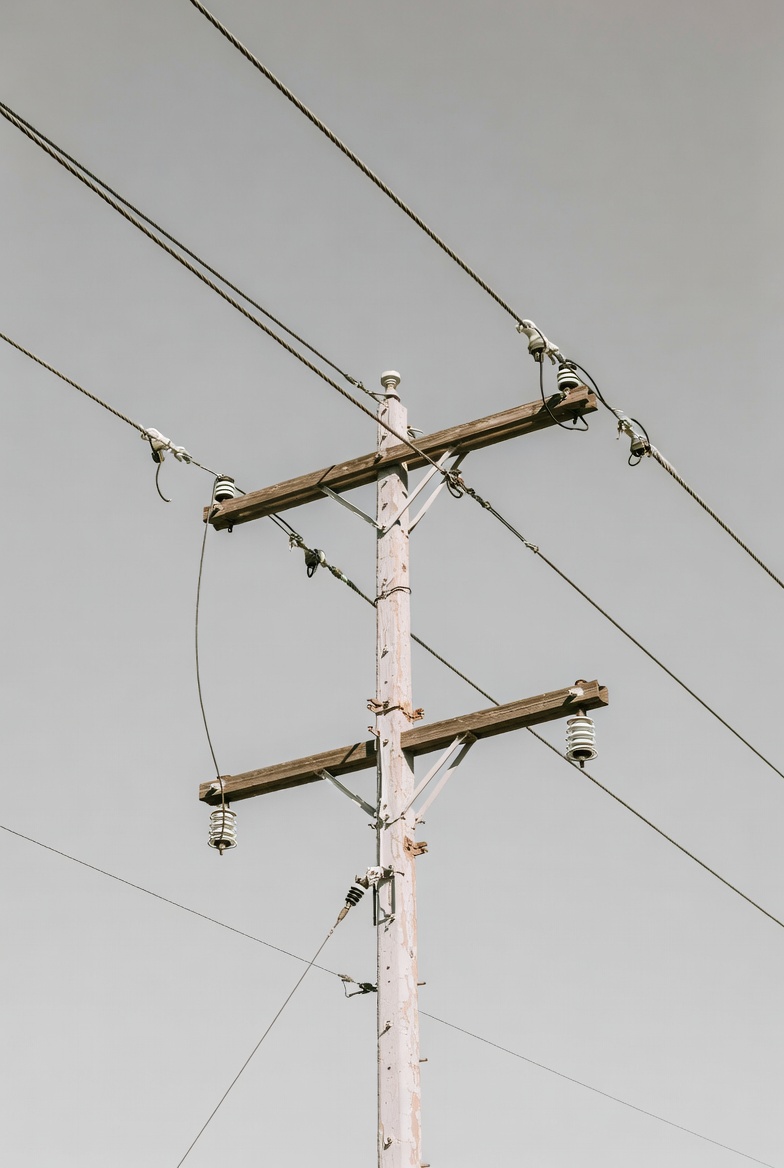 A wooden utility pole stands tall against a clear gray sky. Power lines stretch across the scene, connecting to various points.