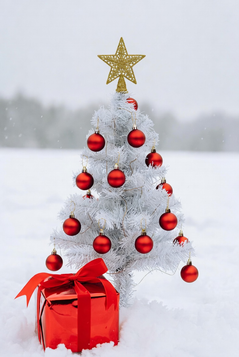A white Christmas tree stands in the snow with red ornaments and a golden star. A wrapped gift sits beside the tree.