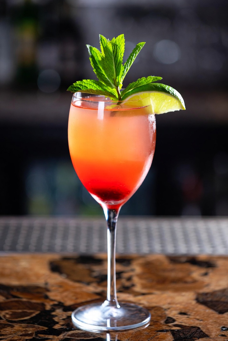 alcohol, bar, beverage, cocktail, colorful, drink, garnish, glass, layered drink, lime, lime wedge, mint, mint leaves, nightlife, orange, party, red, refreshment, relaxing, wooden