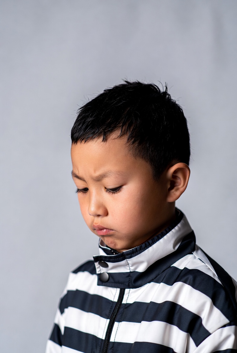 background, boy, child, clothing, day, emotions, expression, hairstyle, indoor, jacket, light, looking down, no smile, pensive, portrait, sadness, serious, simple attire, stripes, youth