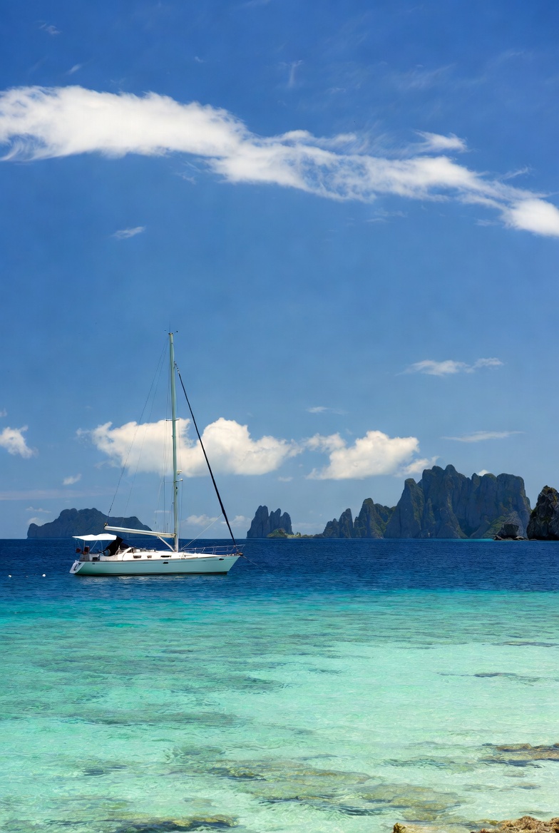 A sailboat floats on clear blue water near rocky coastal islands under a bright sky with fluffy clouds in the background.