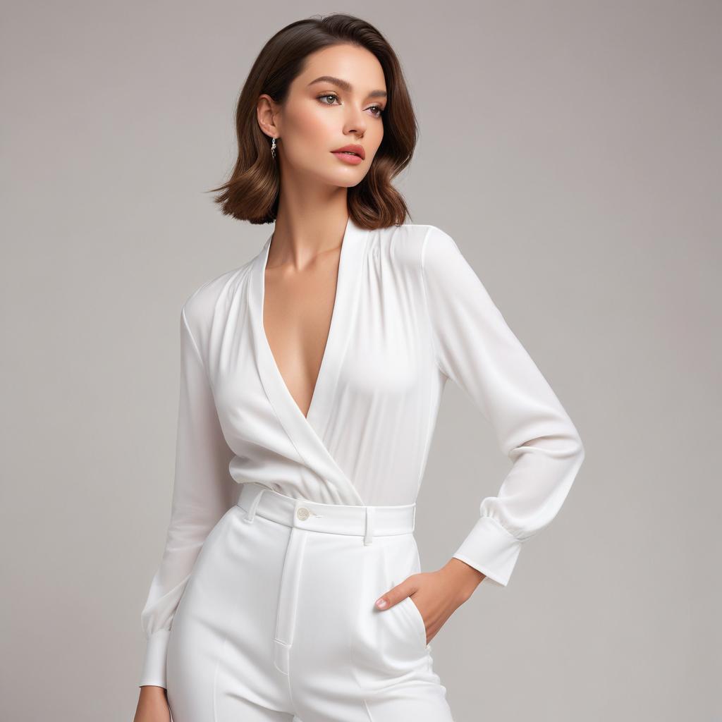 beauty, casual, chic, clothing, confident, elegant, fashion, female, hairstyle, hands, makeup, model, modern, neutral background, portrait, posing, professional, studio, style, white outfit