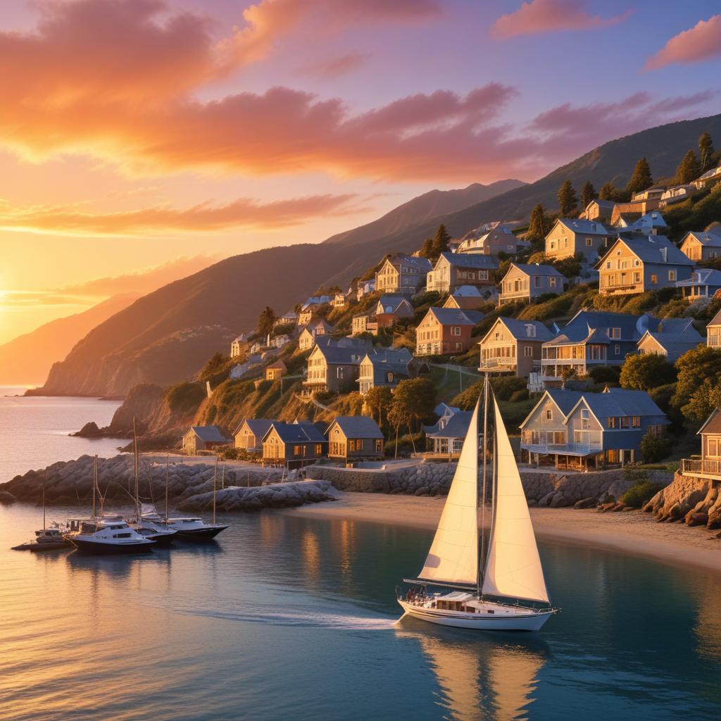 boats, calm, clouds, coastline, evening, harbor, houses, landscape, mountains, nature, outdoor, reflection, sailboats, sailing, scenery, seaside, shore, sky, sunset, water