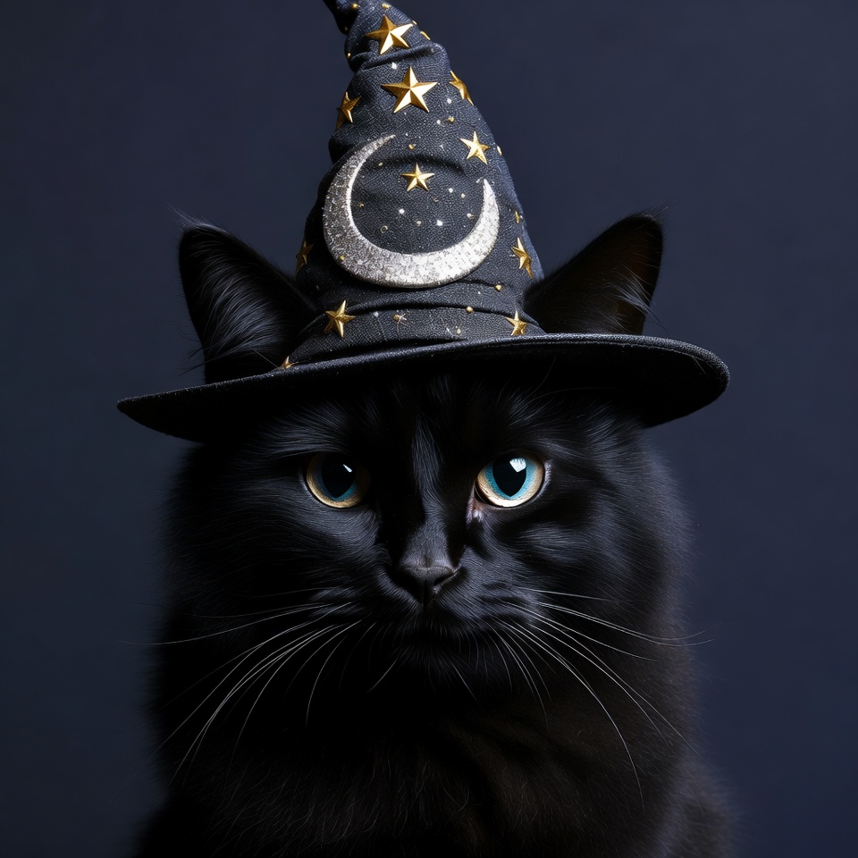 A black cat sits against a dark background, wearing a pointed witch hat decorated with stars and a moon design.