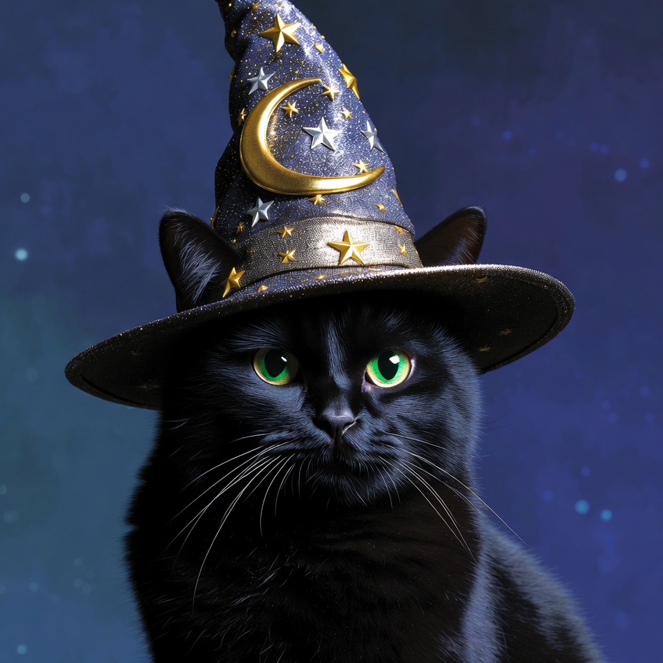 A black cat sits in front of a dark sky wearing a shimmering wizard hat with stars and moons. Its bright green eyes stand out.
