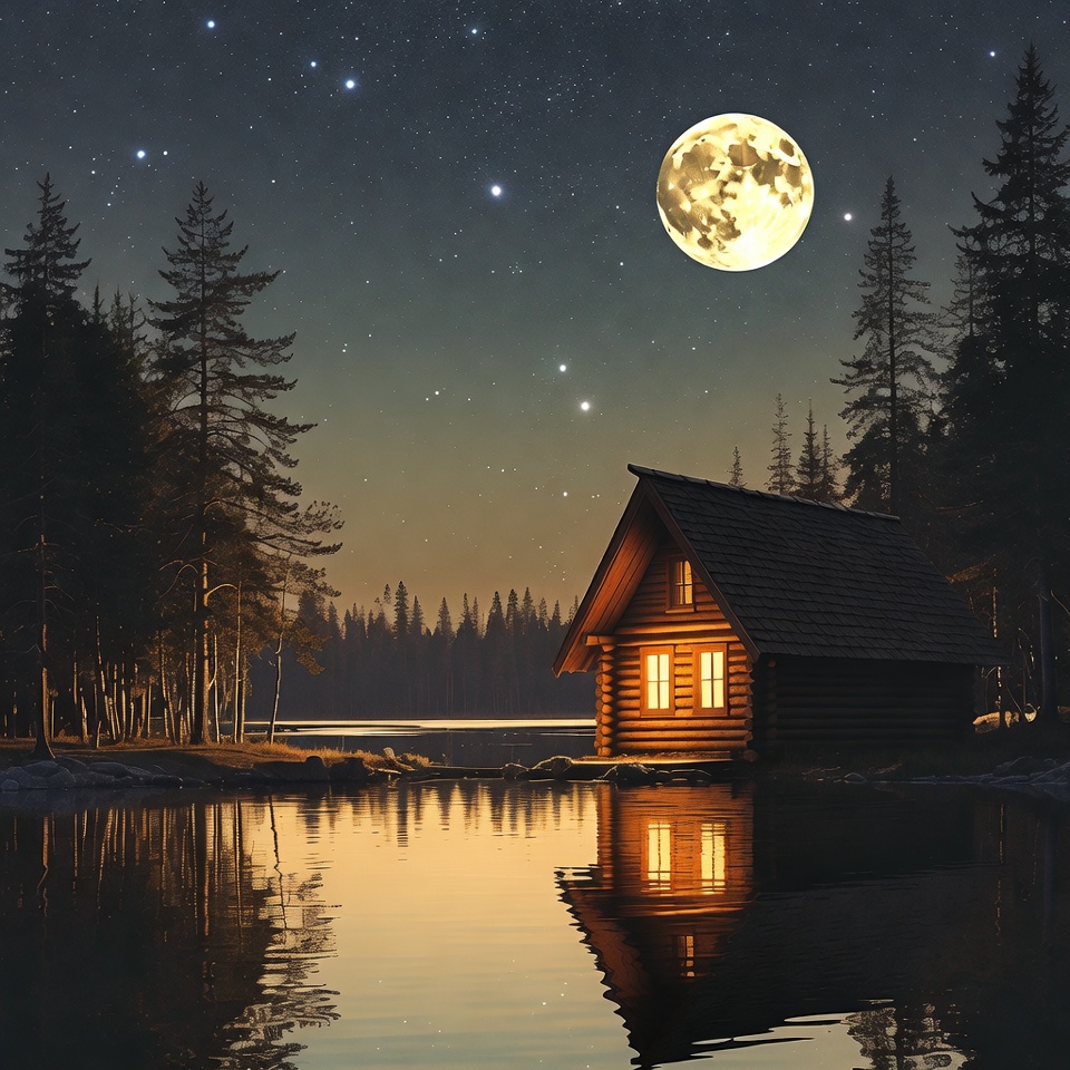A wooden cabin stands by a lake at night. The moon shines bright above while stars fill the sky, reflecting on the water's surface.