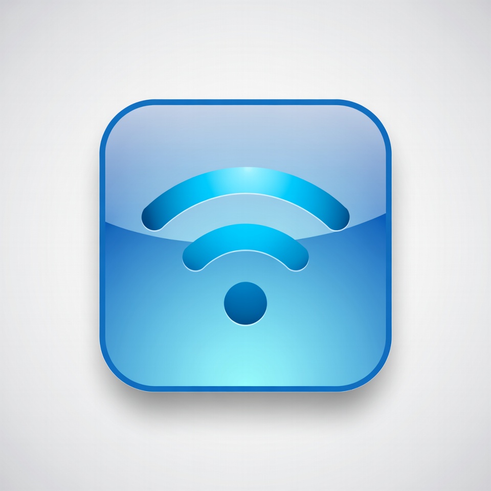 A blue graphic shows a Wi-Fi signal icon with curved lines and a central dot. The design has a smooth, rounded look and minimal style.
