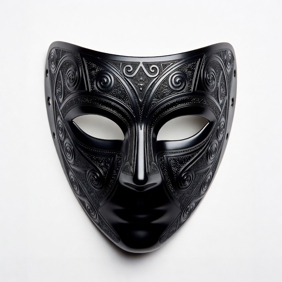 A black mask shows intricate designs and shapes. It is placed on a white background. The mask lacks color and texture details.